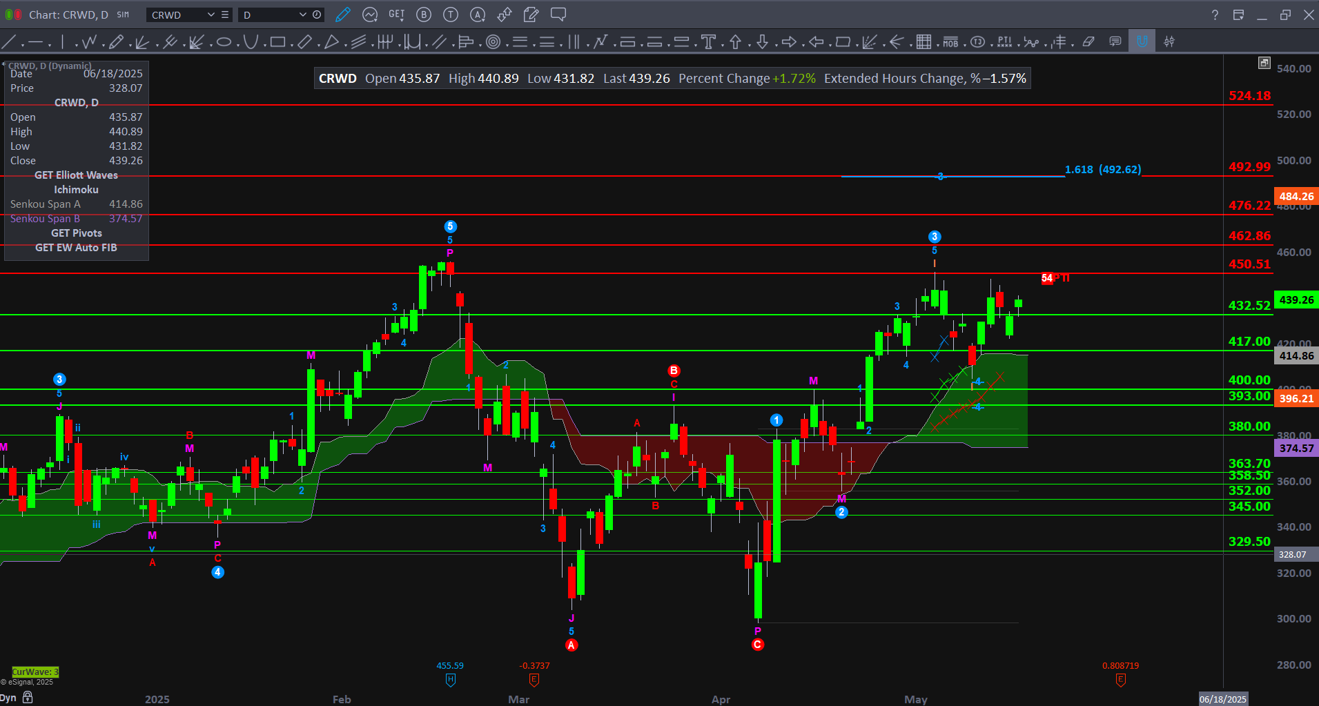 $CRWD is unfolding a strong Wave 3 to the upside, following a corrective Wave 2 that held firmly above the Ichimoku cloud base and pivot zone near 380–393. The recent breakout above 417.00 and 432.52 has confirmed bullish continuation, with impulsive candles and clean Elliott structure.