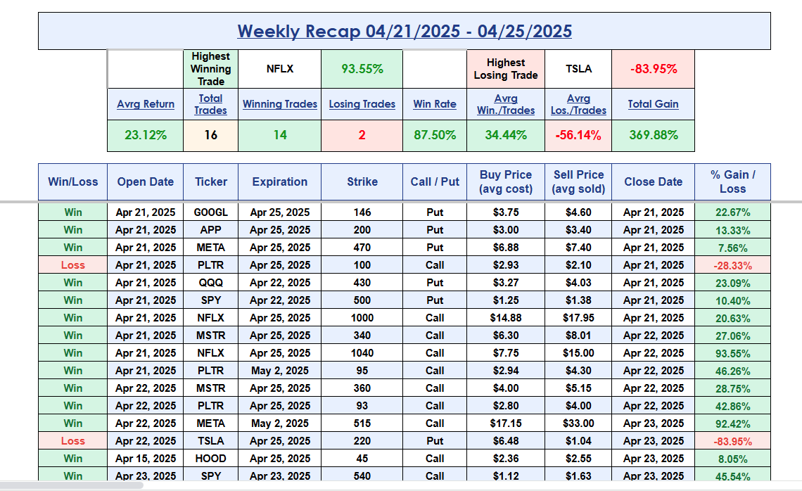 Here’s your quick-hit recap of how our trades performed during the week of April 21–25, 2025. It was a high-conviction week with outstanding win rates, smart setups, and one big standout: Netflix (NFLX).