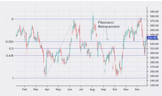 • Fibonacci retracement levels connect any two points that the trader views as relevant, typically a high point and a low point.