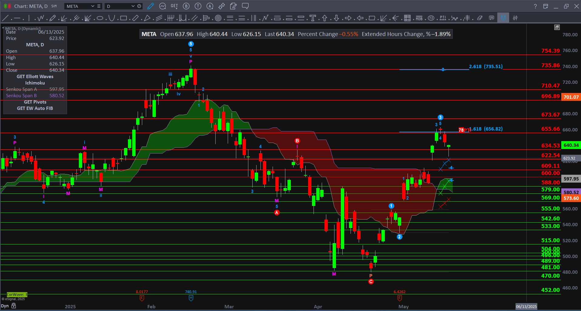 $META is following a classic impulsive breakout structure consistent with Wave 3. Price has cleared major cloud resistance and is approaching the 1.618 Fib extension. Watch for continuation above 656.82 to confirm momentum or for a corrective pullback to retest lower supports before the next leg higher.