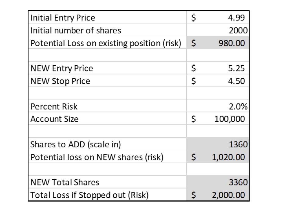 New entry price is $5.25. Using the math for scaling in, we can now add an additional 1360 shares to our position, bringing our new total position to 3360 shares (we had 2000 to start with.)