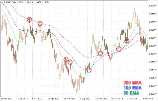 Dynamic support and resistance levels are especially interesting, because they move and change their levels with each new period. As their name implies, those levels are dynamic and are drawn by moving averages. The typical settings for moving averages to act as dynamic support and resistance levels are 50-period MAs, 100-period MAs, and 200-period MAs. While simple moving averages can also be used in this regard, exponential moving averages usually return better results as they better account for the most recent price action.