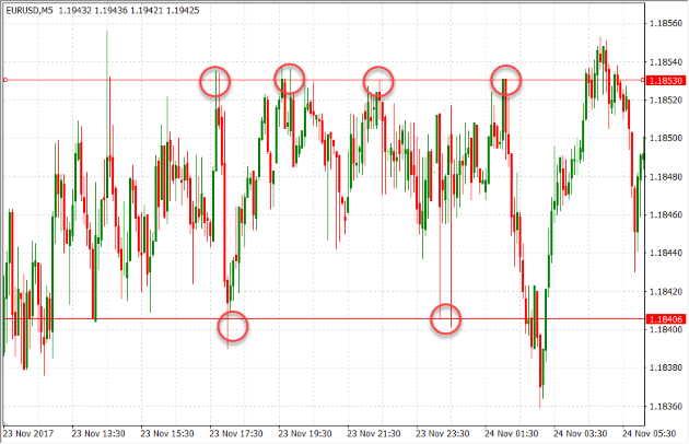 As you can see on right-hand side of the chart, the price broke both the lower support line and upper resistance line, creating false breakout signals only to return to the trading range again. This is one of the reasons why we want to avoid trading on the 5-minute chart shown above, and rather focus on longer term timeframes such as the H4 or daily.