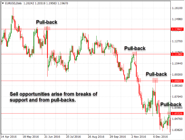 Basically, with each break of a support line during a downtrend, that support line turns into a resistance and we can wait for a so called “pull-back” to that resistance line and thereby enter a high-probability short position.
