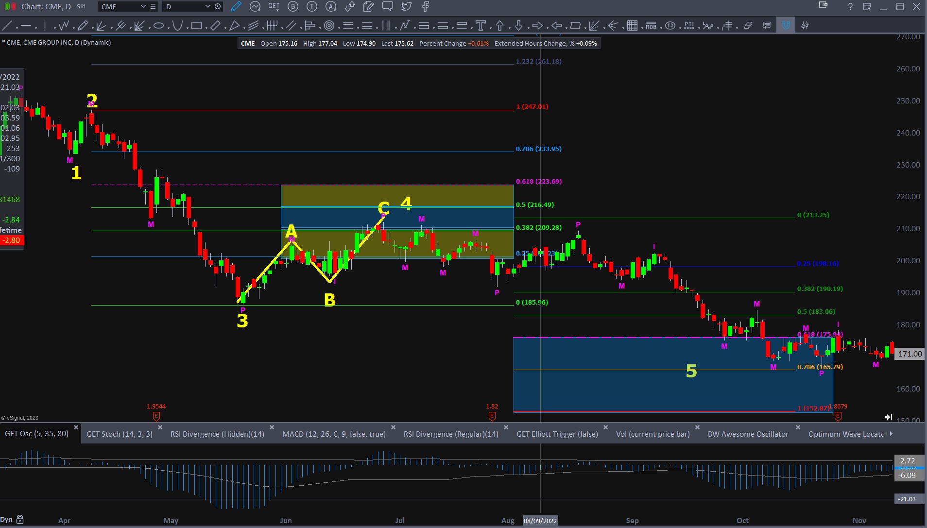 On above image $CME, notice that all of the rules are met for wave 3, then 1 and 2 and for wave 4. The ABC pattern for wave 4 is labeled.