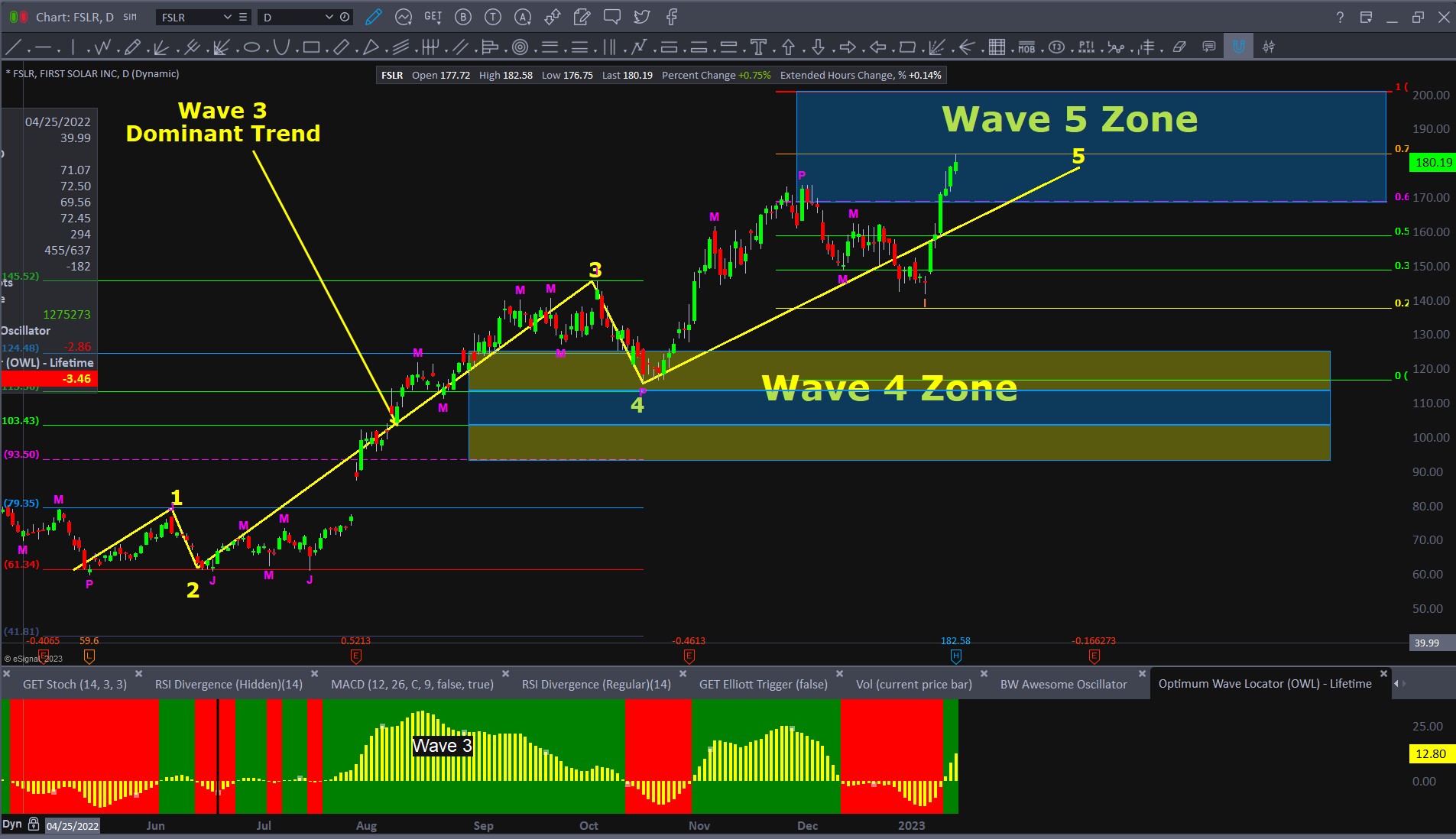 Above image is a daily stock chart for $FSLR The waves are correctly labeled and you can see that wave 3 completed and then the trend was confirmed to change to corrective. Wave 4 met all the rules almost perfectly.