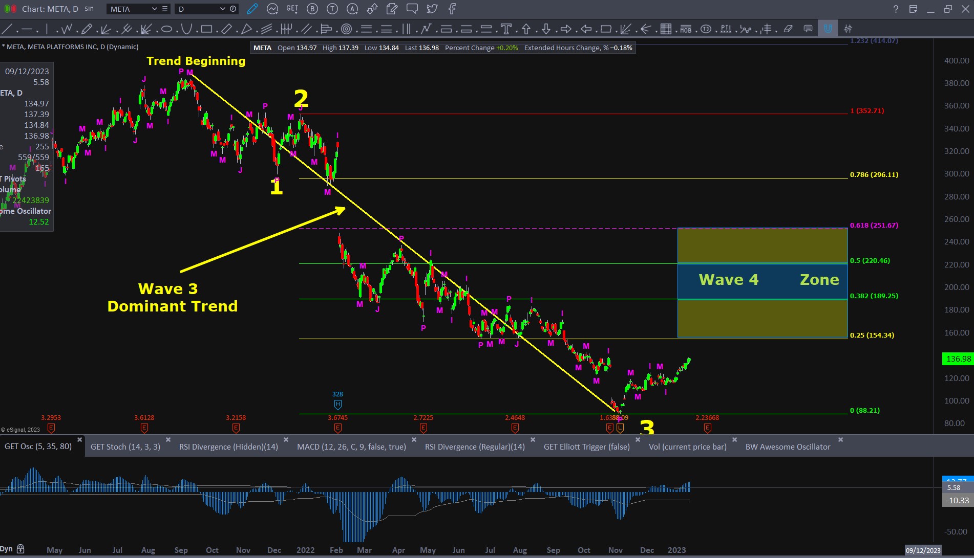 $META on a daily chart. This is a great example of a Bearish Trend that has completed waves 1, 2, 3 and has a potential wave 4 in progress. At this point we have no way of knowing if wave 4 will continue up some more, or begin the next move down into wave 5. We have to wait for confirmation of a trend change using some rules.