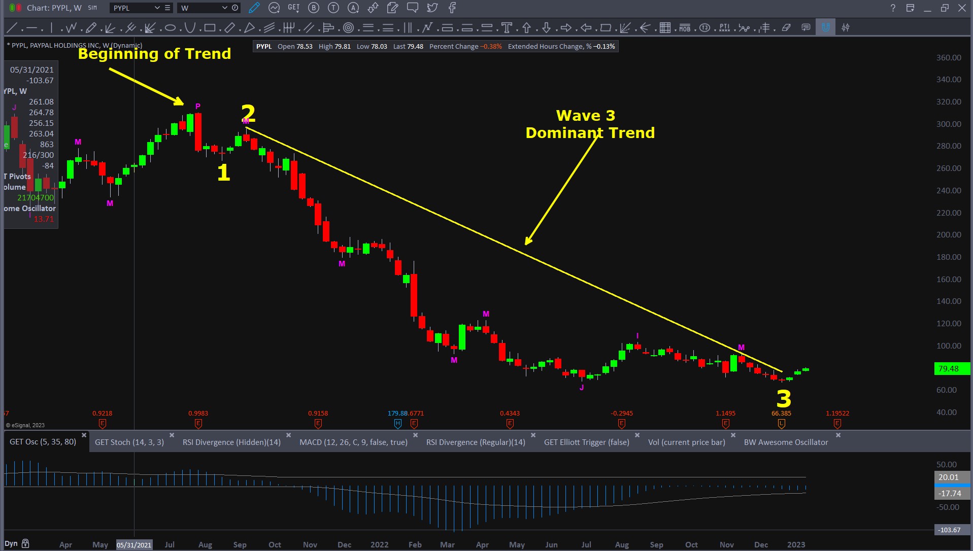 Notice in both the $PYPL and $OKE examples, wave 3 is an uninterrupted series of Higher Highs – Higher Lows for the Bullish uptrend and Lower Lows – Lower Highs for the Bearish downtrend.